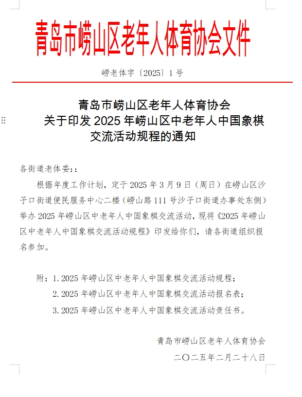 报名:各街道请于2025年 3月6日前,通过电子邮件将加盖公章的《2025年崂山区中老年中国象棋交流活动报名表》(附件2),分别报青岛市崂山区老年人体育协会和青岛市崂山区象棋运动协会。