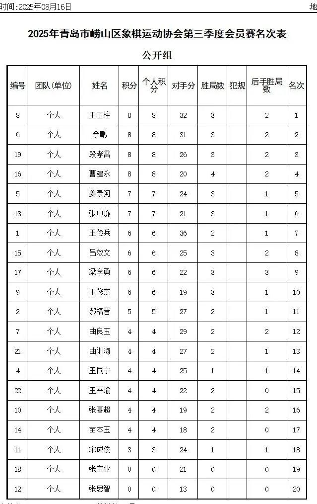 2025年8月16日,青岛市崂山区象棋运动协会第三季度会员赛在协会活动室圆满结束。本次比赛吸引了20余名会员积极参赛,来自各行各业的棋友们齐聚一堂,在纵横十九道的棋盘上各显身手,以棋会友、以赛促学,共同书写了一段精彩的棋坛佳话。